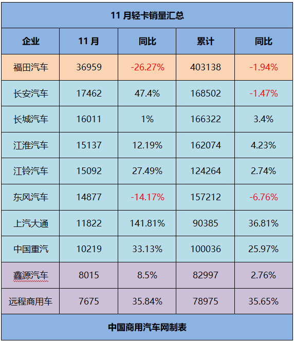- 11月轻卡销量18万辆, 大通、重汽冲入第一梯队
