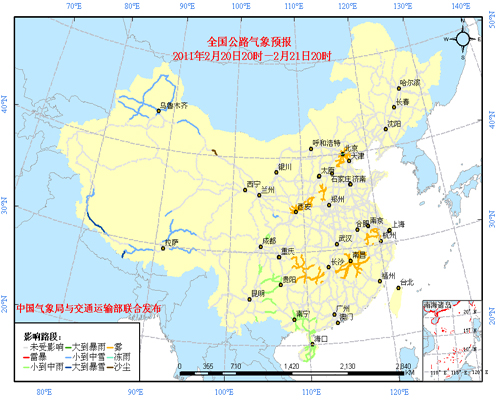 20日20时至21日20时,新疆北部、西藏中西部、贵州西部、广西西部和南部、海南东部等地有小到中雪(雨)或雨夹雪,其中,西藏西南部的局地有中到大雪。内蒙古西北部和甘肃北部的局部地区有沙尘。另外,北京、河北中部、山西南部、陕西东南部、江苏西南部、安徽东南部、浙江西北部、江西中北部、湖南西部、重庆东南部和贵州东部的部分地区有雾。