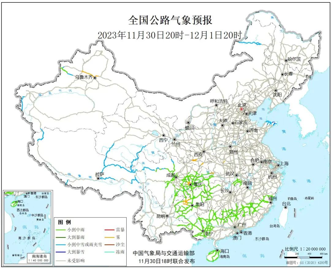 11月30日20时至12月1日20时,内蒙古东北部、新疆南疆西部山区、西藏东北部和西部、青海南部、川西高原北部等地部分地区有小雪或雨夹雪,其中,西藏东北部、山东半岛等地部分地区有中到大雪。福建中北部、江西南部、湖南南部、广东北部、广西大部、四川盆地东部、重庆、贵州、海南岛等地部分地区有小雨,其中,海南岛东部等地部分地区有中雨。河南西南部、湖北西部、重庆西南部和东北部、贵州西部、陕西南部、新疆北部等地局地有雾。另外,川藏铁路配套工程公路的部分路段受小雪或雨夹雪影响,需防范对施工建设和物资运输的不利影响。