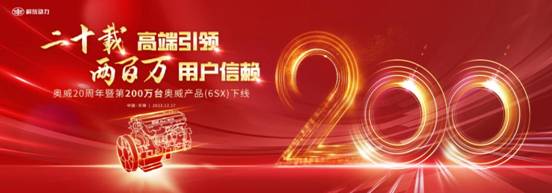 中国商用汽车网讯 2023年12月17日,“二十载高端引领、两百万用户信赖——奥威20周年暨第200万台奥威产品(6SX)下线仪式”在江苏无锡隆重举行。2003年,奥威CA6DL在无锡投产,实现了我国内燃机开发制造水平的“大跨越”;20年后,同样在无锡,无数荣耀加身的奥威继续载誉前行,以20年技术积淀,引领智慧动力域新时代。