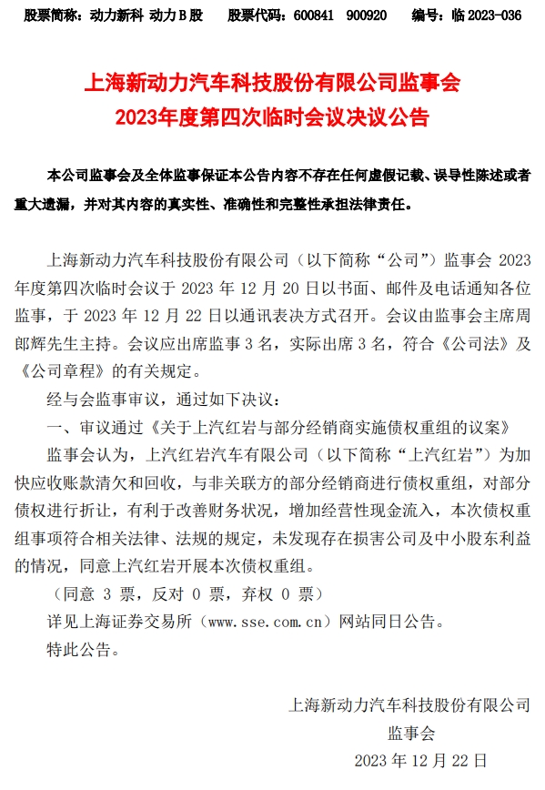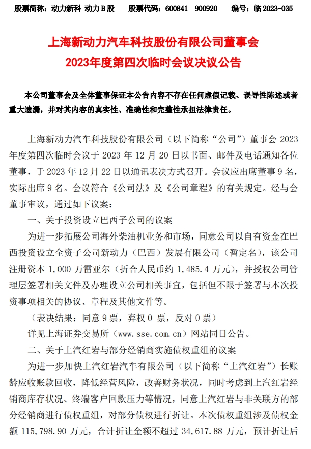 12月22日晚间,上海新动力汽车科技股份有限公司(以下简称“公司”)发布公告,公司董事会2023年度第四次临时会议于2023年12月22日以通讯表决方式召开。会议应出席董事9名,实际出席9名。会议符合《公司法》及《公司章程》的有关规定。经与会董事审议,通过如下议案:
