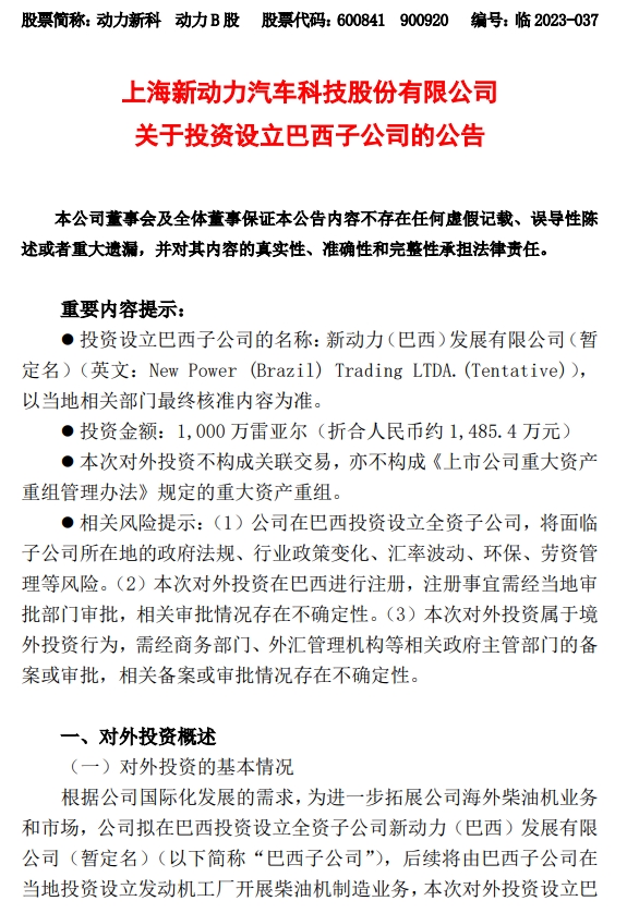为进一步拓展公司海外柴油机业务和市场,同意公司以自有资金在巴西投资设立全资子公司新动力(巴西)发展有限公司(暂定名),该公司注册资本1,000万雷亚尔(折合人民币约1,485.4万元),并授权公司管理层签署相关文件及办理设立公司相关事宜,包括但不限于签署与本次投资事项相关的协议、章程及其他文件等。