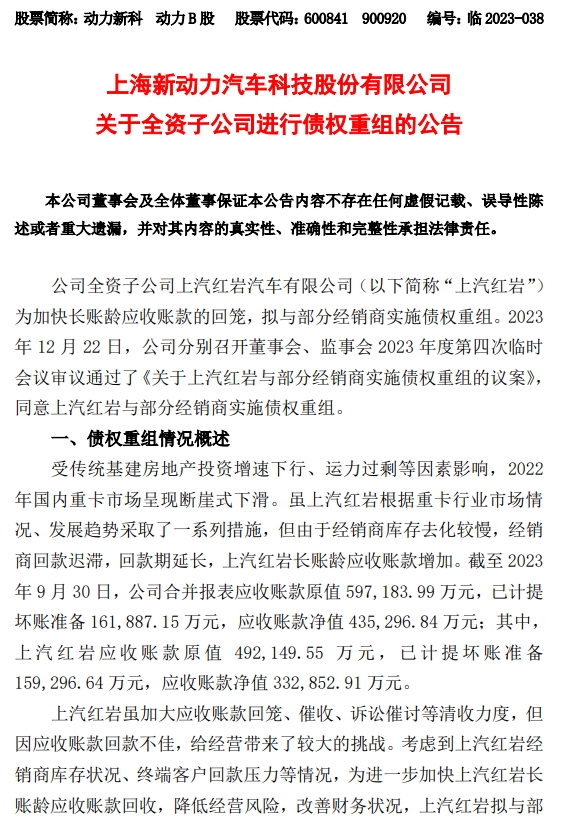 公司全资子公司上汽红岩汽车有限公司(以下简称“上汽红岩”)为加快长账龄应收账款的回笼,拟与部分经销商实施债权重组。2023年12月22日,公司分别召开董事会、监事会2023年度第四次临时会议审议通过了《关于上汽红岩与部分经销商实施债权重组的议案》,同意上汽红岩与部分经销商实施债权重组。