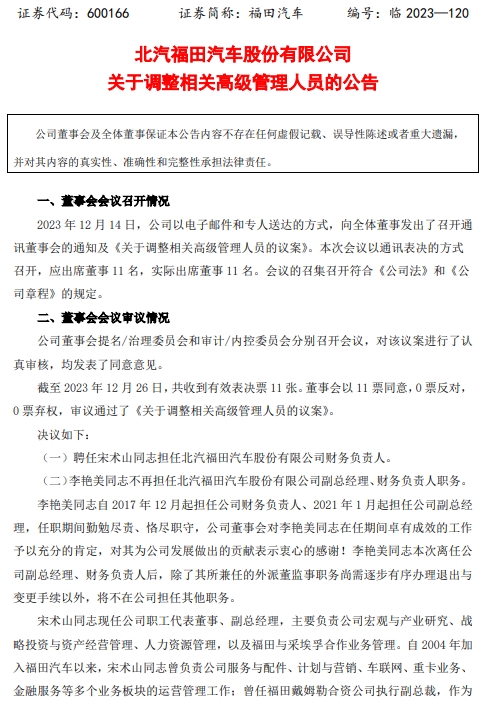 2023年12月27日,北汽福田汽车股份有限公司(下称:公司)发布关于调整相关高级管理人员的公告。