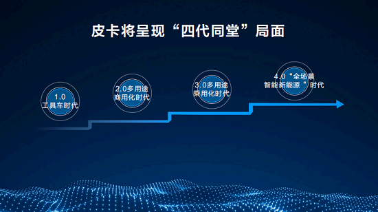中国皮卡品类持续进化,形成了“四代同堂“格局:1.0工具车时代、2.0多用途商用化时代、3.0多用途乘用化时代,如今即将迎来“4.0全场景智能新能源”时代。