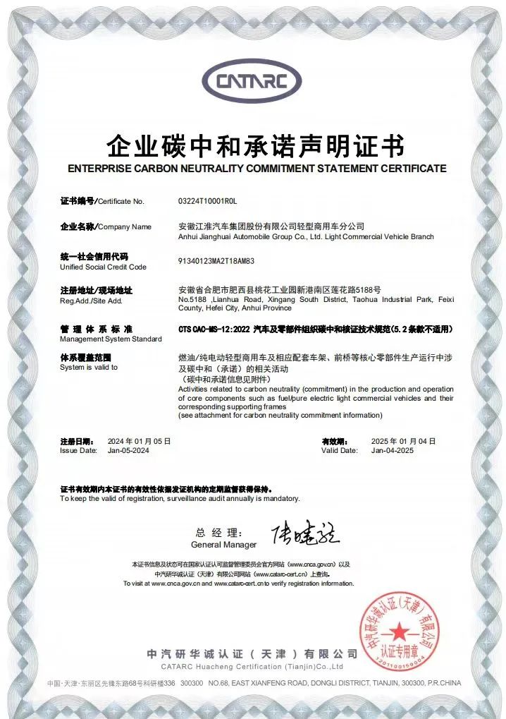 近日,江汽集团轻型商用车分公司获得由中汽研颁发的“企业碳中和承诺声明证书”,将于2024年上半年获得“零碳工厂”认证,届时,江汽集团新港商用车基地将成为全省行业内首例经中汽研权威认证的“零碳示范工厂”。