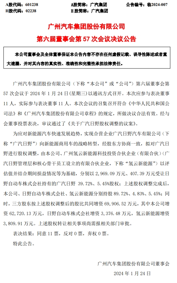 1月24日晚间,广汽集团公告,拟对广汽日野进行股权调整,由本公司、广州氢云新能源科技投资合伙企业(有限合伙)分别以2969.09万元、407.39万元受让日野自动车株式会社持有的广汽日野39.72%、5.45%股权;上述股权调整完成后,本公司、日野自动车株式会社、氢云新能源分别持股89.72%、4.83%、5.45%;同时,三方股东按上述股权调整后的股比共同增资7亿元。