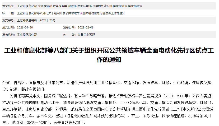 2023年11月13日,工业和信息化部、交通运输部等八部门正式印发《关于启动第一批公共领域车辆全面电动化先行区试点的通知》(以下简称:《通知》)。经研究,确定北京等15个城市为此次试点城市,鼓励探索形成一批可复制可推广的经验和模式,为新能源汽车全面市场化拓展和绿色低碳交通运输体系建设发挥示范带动作用。