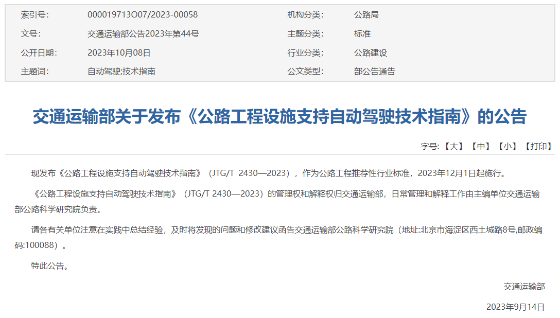 2023年11月5日,交通运输部印发《自动驾驶汽车运输安全服务指南(试行)》(以下简称《指南》)。《指南》明确了在现行法律法规框架下使用自动驾驶汽车从事运输经营活动的基本要求,引导自动驾驶运输服务健康有序发展,最大限度防范化解运输安全风险,切实保障人民群众生命财产安全。