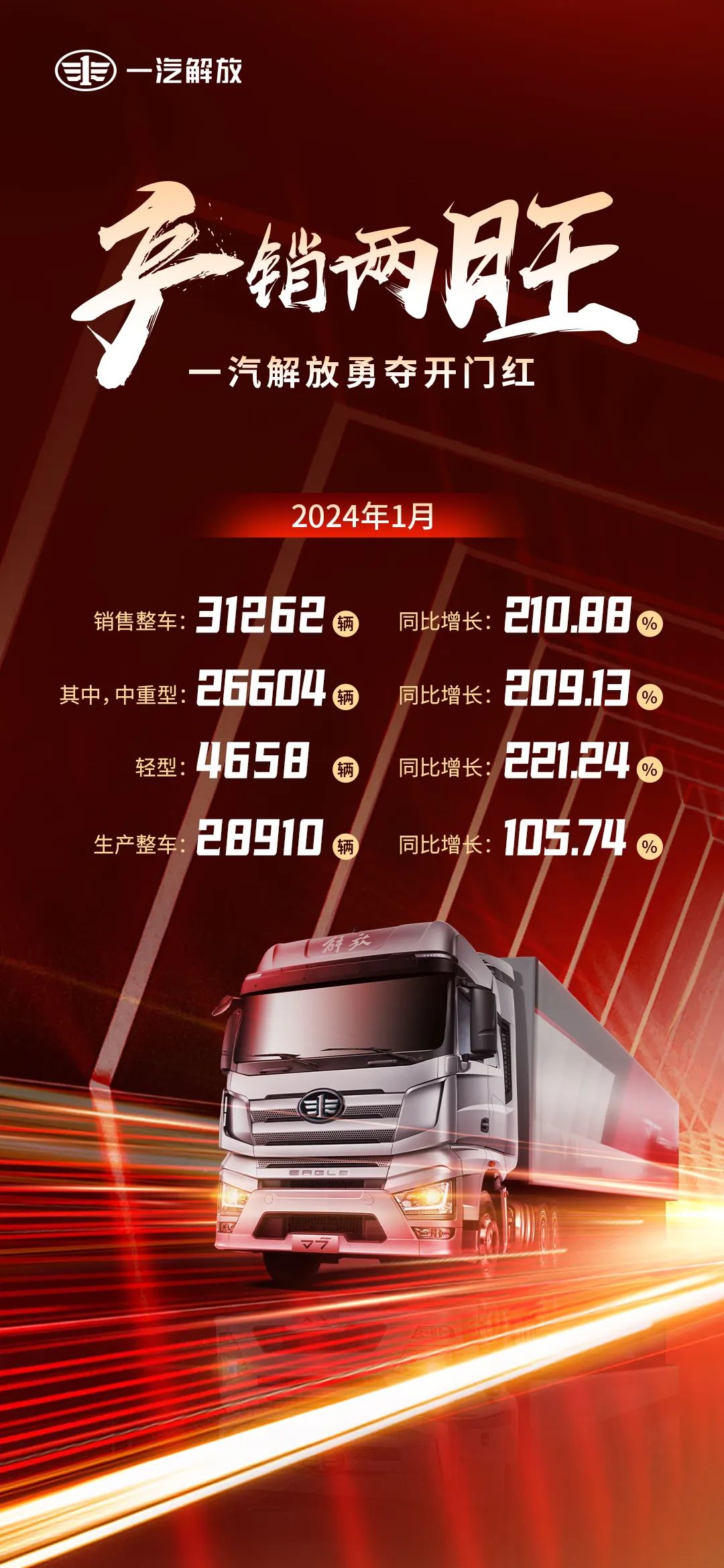 2024年,一汽解放各战线以“开局就是决战、起步就是冲刺”的实干精神,紧抓市场机遇、主动出击、科学谋划,全力打赢“开门红”!生产体系坚持精益导向,狠抓物流保障和精益改善,不断提高生产综合效率,持续掀起生产大干热潮;营销体系坚持以用户为中心,设计贴合用户运营、生活场景的“七重大礼”,在全国范围内开展“大拜年”活动,通过明确产品定位,精准制定销售策略,快速拉动增量;各职能体系聚焦“四大攻坚战”统筹规划、合理安排,全力支撑销售需求,为“冲刺一季度,打赢开门红”提供了坚实保障。