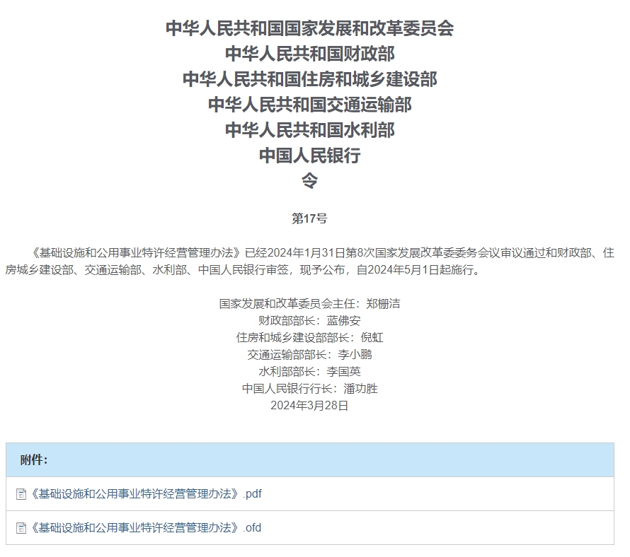 日前,国家发展改革委会同财政部、住房和城乡建设部、交通运输部、水利部、中国人民银行对《基础设施和公用事业特许经营管理办法》(以下简称《管理办法》)进行了修订,自2024年5月1日起施行。