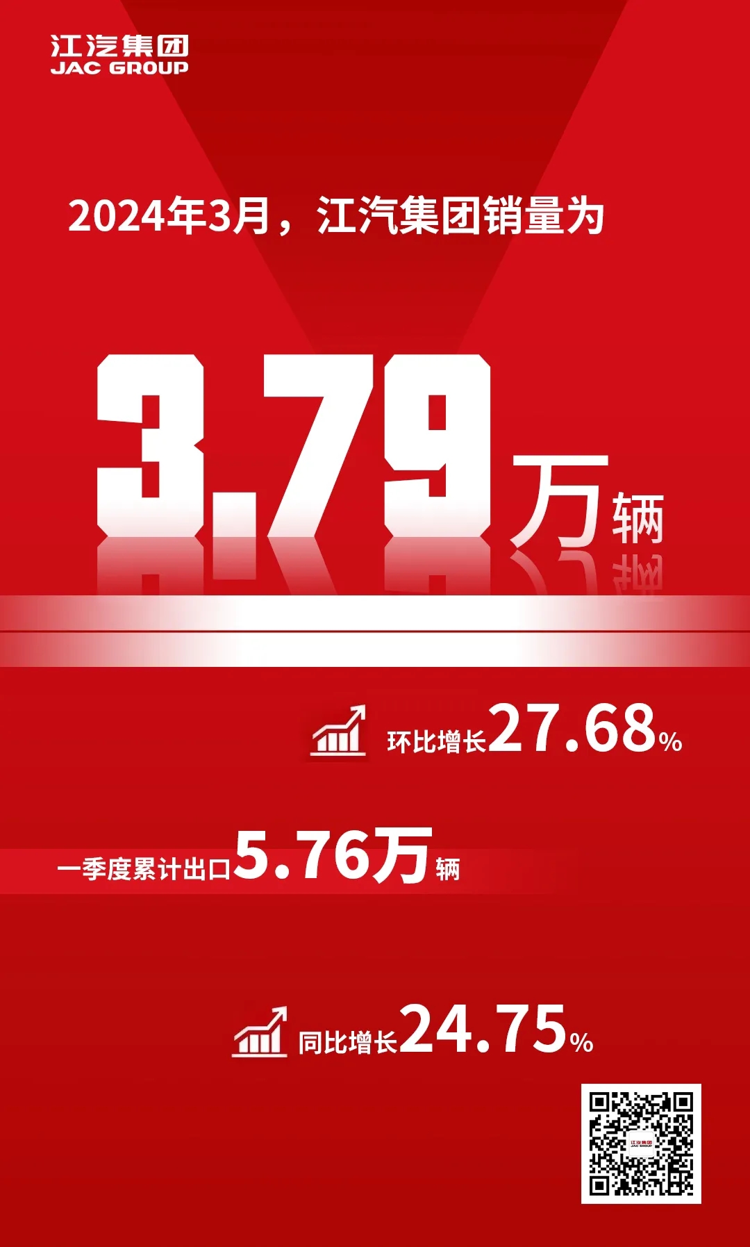 4月9日,安徽江淮汽车集团股份有限公司(以下简称“江汽集团”)发布《安徽江淮汽车集团股份有限公司2024年3月产、销快报》(下称“公告”)。公告显示:2024年3月,江汽集团销量为3.79万辆,环比增长27.68%;其中,3月出口2.06万辆,同比增长8.13%,一季度累计出口5.76万辆,同比增长24.75%。