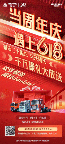 活动期间,豪沃重卡针对“豪沃20周年庆典暨第200万辆豪沃下线”和“618礼享节”持续回馈卡友,千万豪礼大放送。即日起至6月30日每天上午10点,可通过“中国重汽豪沃重卡”公众号扫码参与豪沃20周年庆活动,即享厂家直送购车立减特惠;6月10日-6月30日,意向客户进店咨询,可领取精美豪沃礼品一份;定金起航礼——活动期间,交6元定金留资,可获得价值2000元的购车代用券;创富无忧礼——凡购车成功的用户,则赠送一张价值8888元的油/气卡一张;金榜题名礼——中国重汽豪沃重卡为考生家庭提供“清华北大梦”“985/211梦”“普通本科院校梦”助学礼遇,针对有家庭成员被以上大学录取的客户,分别按照“三梦”标准给予5000、1000和车模、学习用品等奖励;超值置换礼——其他品牌重卡置换豪沃重卡,享置换大礼包,老客户换购加送大礼包。赶快咨询当地豪沃品牌经销商,参与豪礼抢购吧!