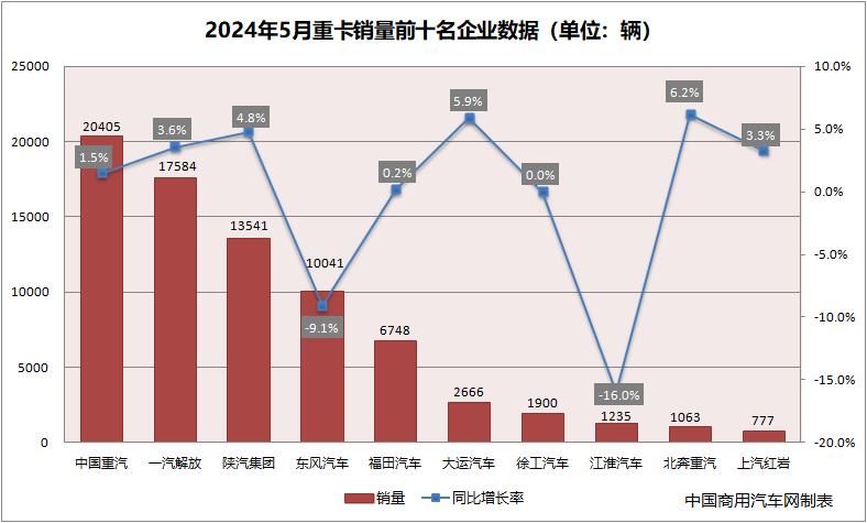 从各企业具体表现来看,中国重汽5月销售重卡20405辆,同比增长1.5%,销量排名行业第一。中国重汽继续保持其在市场中的领先地位,继续扩大销量冠军优势。