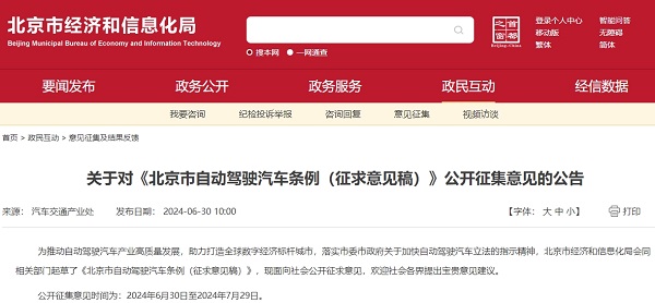 中国经济网7月2日讯(记者 姜智文)6月30日,北京市经济和信息化局发布《北京市自动驾驶汽车条例(征求意见稿)》(以下简称“征求意见稿”)提出,支持自动驾驶汽车用于城市公共电汽车客运、出租汽车客运(网约车)、汽车租赁等城市出行服务。