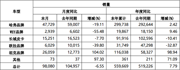 长城皮卡、欧拉品牌以及WEY品牌今年上半年累计销量分别为9.19万辆、3.17万辆以及1.99万辆,同比分别下滑10.41%、下滑32.87%以及增长9.46%。