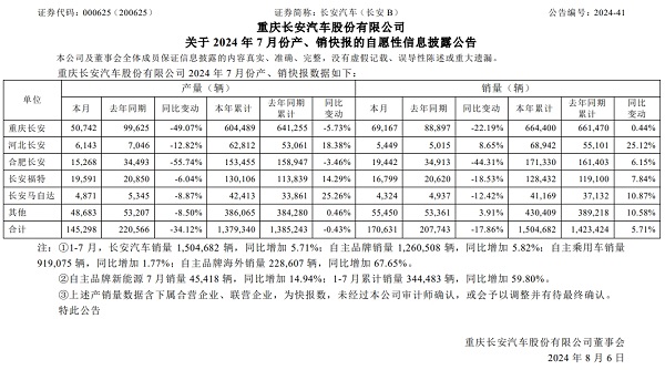 长安汽车7月销量17.06万辆,同比下降17.86%