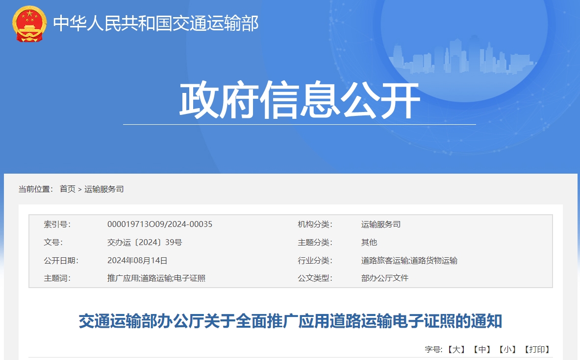中国商用汽车网讯 8月14日,交通运输部办公厅发布《关于全面推广应用道路运输电子证照的通知》(以下简称:《通知》)。《通知》明确,到2025年底,新制发及换发道路运输证照全部实现电子化,电子证照数据合规率和证照归集率达到95%以上。