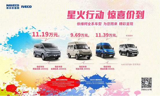 在获得上述优惠福利的同时,购买依维柯的用户还可以享受到国家以旧换新补贴。其中,个人购买排量小于2.0L的多用途车每台补贴15000元,该条政策适用于欧胜F1A车型及聚星多用途乘用车;个人购买的电动多用途乘用车、客车每台补贴20000元,这项补贴则适用于聚星电动车。此外,南京依维柯也为广大消费者贴心的送上NAVECO置换保险。其中,聚星柴油车的保险兑现权益为40000元/台,依维柯电动车的保险兑换权益为20000元/台。