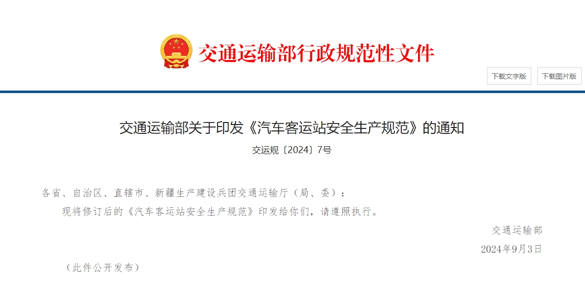 近日,交通运输部修订印发《汽车客运站安全生产规范》(交运规〔2024〕7号,以下简称《规范》),将于2024年11月1日起施行。