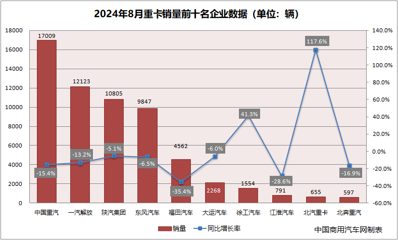 北奔重汽8月销售重卡597辆,同比下降16.9%,销量排名行业第十。