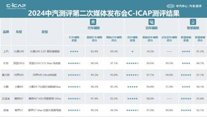 本次共发布6款车型测评结果,分别是大通G90、小鹏X9、深蓝SL03、腾势N7、问界M9和智界S7。按照C-ICAP(1.1版)进行测试评价:小鹏X9、深蓝SL03、腾势N7、问界M9、智界S7行车辅助获得“5星+”, 深蓝SL03、问界M9、智界S7泊车辅助获得“5星+”, 腾势N7、问界M9、智界S7智慧座舱获得5星。