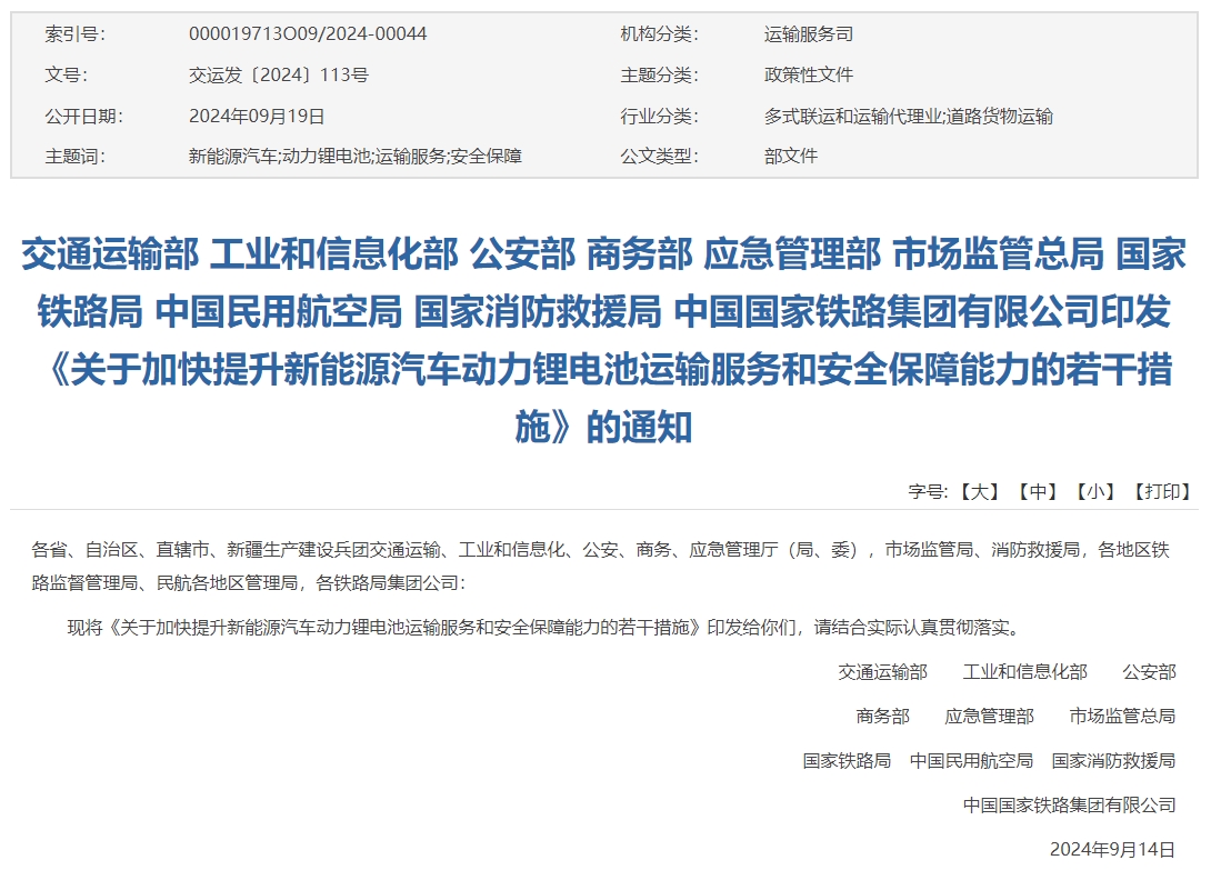 9月19日,交通运输部会同工业和信息化部、公安部、商务部、应急管理部、市场监管总局、国家铁路局、中国民用航空局、国家消防救援局、中国国家铁路集团有限公司等9个部门和单位联合印发《关于加快提升新能源汽车动力锂电池运输服务和安全保障能力的若干措施》(以下简称:《若干措施》)。