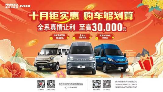 这个十月,让我们一起开启依维柯的钜惠之旅。无论是商务出行还是家庭出游,依维柯都将是您最可靠的伙伴。通过努力,南京依维柯将让每一位用户都能感受到卓越品质和贴心服务,共同开启一段全新的旅程,共同见证“星火计划”带来的变革与辉煌!