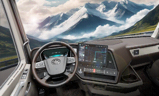 车辆搭载12.3英寸全液晶仪表与15.6英寸车机屏组合,为用户提供全新人机交互界面。当中,12.3英寸全液晶仪表,采用“三种模式”界面设计,能为提供不同感官体验。15.6英寸车机屏幕更是首次应用于商用车领域,其手机式的操作界面,增强了操作流畅度与直观性。此外,集成的高德商用车导航、智能空调控制、TPMS显示控制等功能,也为用户提升操作便利性。该车还能实时交互驾驶信息,对司机驾驶行为进行智能节能驾驶评价,辅助驾驶员养成良好的驾驶习惯。