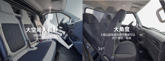 座舱空间大,1.88米的高个用户也不会压抑。E福顺还配备了行业少有的前排纯平三人座,更能满足用户的实际需求。E顺达副驾躺卧角度可达36°,优于高铁一等座的乘坐享受。同时,驾驶舱还拥有超大视野,标配怀挡和电子助力转向,还可配倒车影像,夫妻俩切换开车也完全没问题。