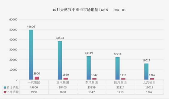 在天然气细分市场,头部车企的竞争依然激烈。10月,天然气中重卡终端需求约8841辆,同今年第二季度、第三季度相比市场略有收缩,这与近期油、气价格“大跳水”相关。随着国际油价的持续低迷,国内多地0号柴油价格破“7”元大关;同期,10月份国内液化天然气价格维持在4200元/吨左右,车用均价超预期下降至4.9元/kg,给选购NG的卡友们带来极大信心。当月,一汽解放NG中重卡销量一马当先,成为行业唯一接近3000辆的车企,份额占到市场32.8%,其他企业NG中重卡销量均在2000辆以下。累计销量方面,一汽解放前10个月NG总销量超4.9万辆,与行业第二名的重汽拉开了“万辆”差距。