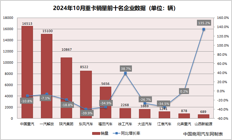 10月重卡销量排名第十的是山西新能源,10月销售重卡689辆,同比增长135.15%。资料显示,该公司位于山西晋中,由吉利汽车100%持股。