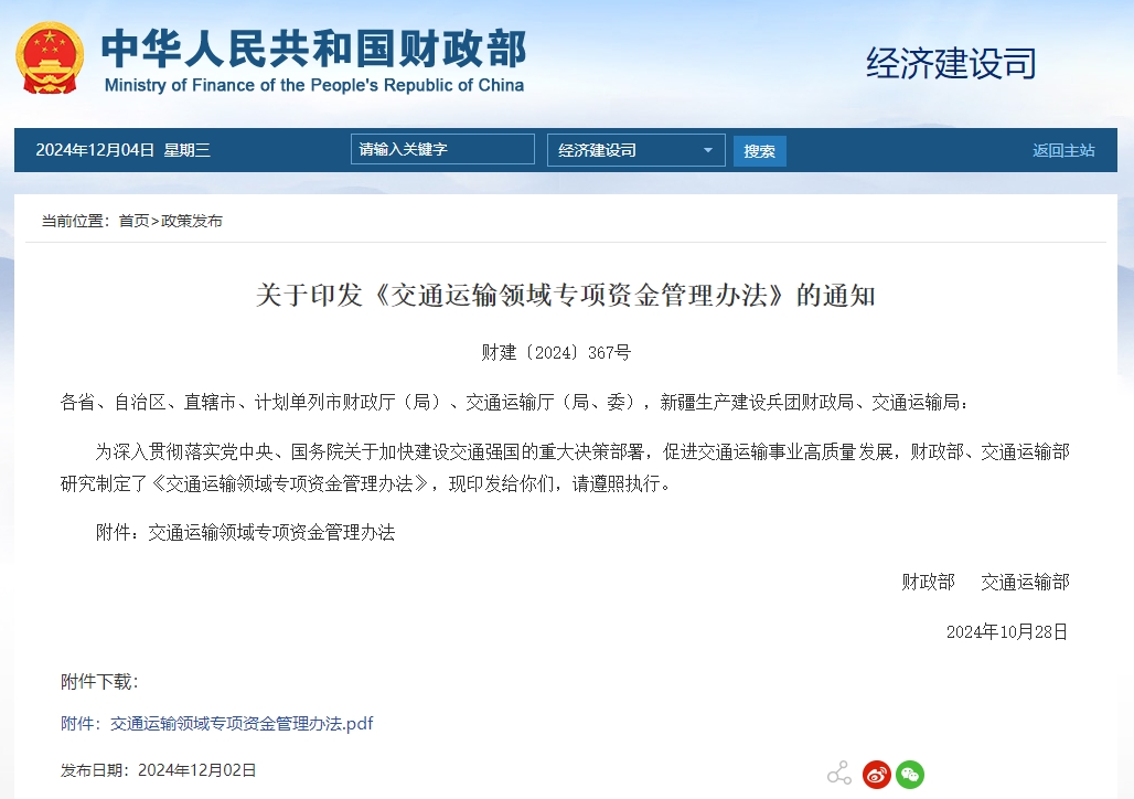 日前,为深入贯彻落实党中央、国务院关于加快建设交通强国的重大决策部署,促进交通运输事业高质量发展,财政部、交通运输部研究制定《交通运输领域重点项目资金管理办法》。办法明确了交通运输领域重点项目资金(以下简称重点项目资金)的支出范围、分配方式、资金审核和下达等。