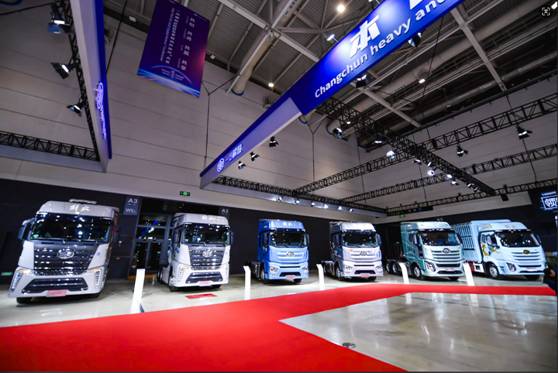 本次展车区,分为室内和室外两个展区。室内展厅共设置了5大展区,分别为本部中重型展区、青岛中重型展区、轻型车展区、海外国际展区以及新能源展区。展车数量超百余台,规模之大再创历史新高,长春总部和青岛基地产品占比最大,轻型车和新能源车次之。