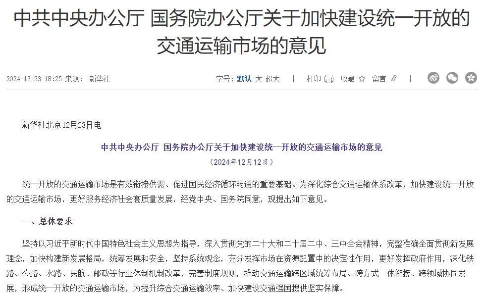 日前,中共中央办公厅 国务院办公厅发布关于加快建设统一开放的交通运输市场的意见(以下简称:《意见》),《意见》明确,完整准确全面贯彻新发展理念,加快构建新发展格局,统筹发展和安全,坚持系统观念,充分发挥市场在资源配置中的决定性作用,更好发挥政府作用,深化铁路、公路、水路、民航、邮政等行业体制机制改革,完善制度规则,推动交通运输跨区域统筹布局、跨方式一体衔接、跨领域协同发展,形成统一开放的交通运输市场,为提升综合交通运输效率、加快建设交通强国提供坚实保障。