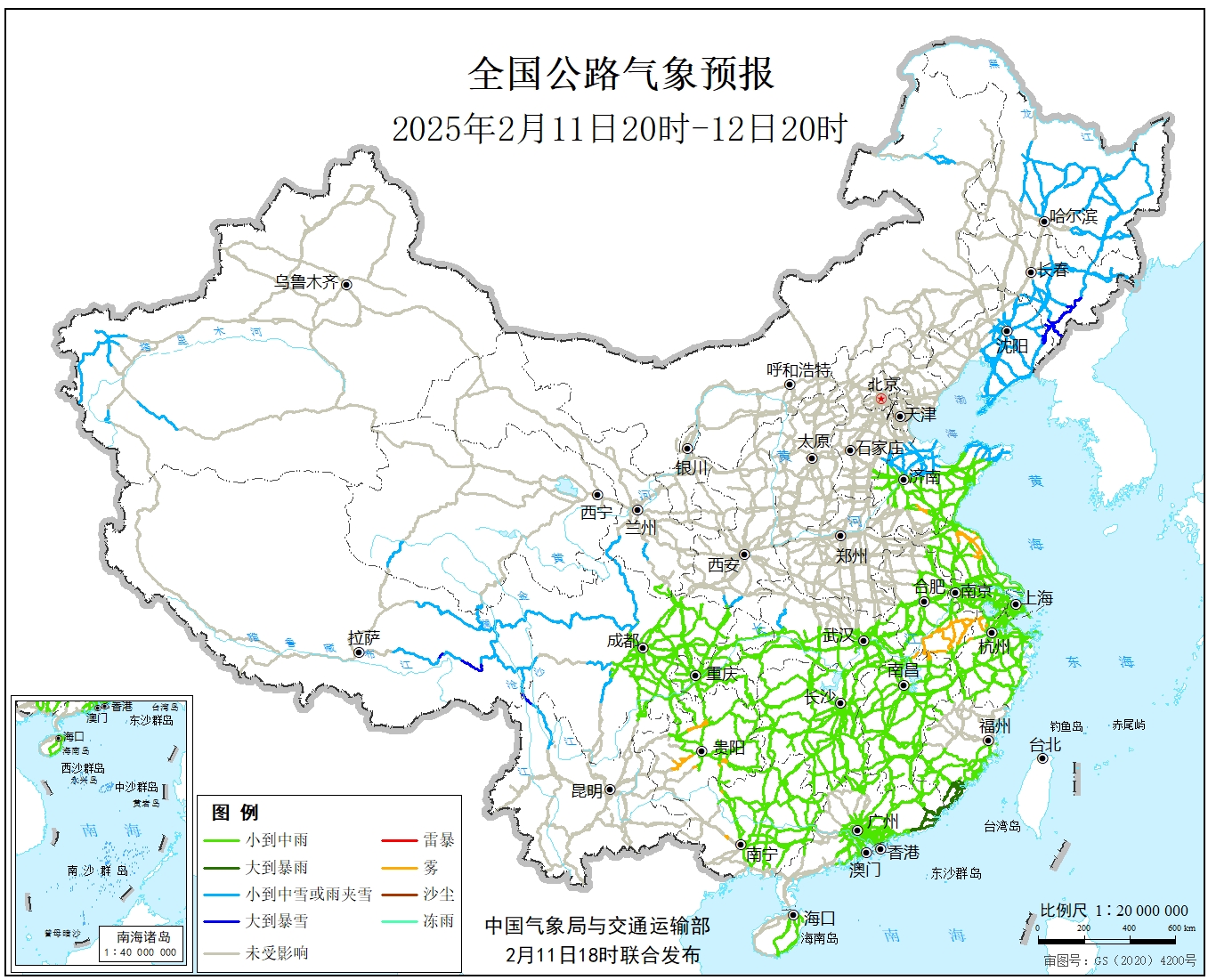 2月11日20时至12日20时,新疆南疆西部山区、西藏东部和北部、青海南部、东北地区东部、川西高原中北部、云南西北部等地部分地区有小到中雪或雨夹雪,其中,吉林东部、辽宁东部、西藏东南部等地部分地区有大雪;湖南中西部、福建东南部、广东东部、西藏东南部等地部分地区有中到大雨,其中,广东东部沿海局地有暴雨。另外,江苏东部、浙江西北部、安徽南部、山东南部、贵州西部等地局地有雾。