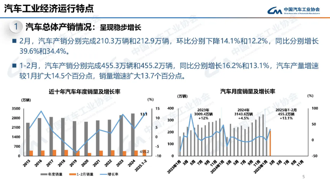 1至2月,汽车产销分别完成455.3万辆和455.2万辆,同比分别增长16.2%和13.1%,汽车产量增速较1月扩大14.5个百分点,销量增速扩大13.7个百分点。