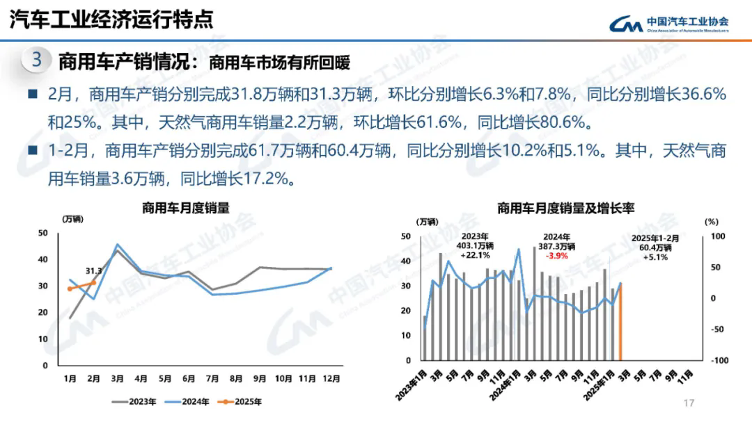 1至2月,商用车产销分别完成61.7万辆和60.4万辆,同比分别增长10.2%和5.1%。其中,天然气商用车销量3.6万辆,同比增长17.2%。