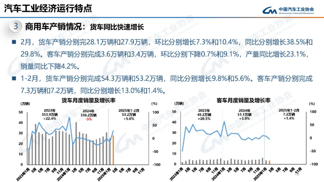 1至2月,货车产销分别完成54.3万辆和53.2万辆,同比分别增长9.8%和5.6%。客车产销分别完成7.3万辆和7.2万辆,同比分别增长13.0%和1.4%。