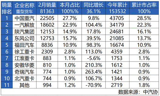 跑出加速度 中国重汽斩获2月重卡销量、市占率双冠军