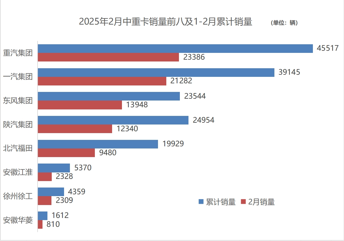 2025年前两个月,我国商用车产销分别实现61.7万辆和60.4万辆,同比分别增长10.2%和5.1%。2月,中重卡提升幅度最大,销量超8.9万辆,较上月环比增长8.6%。从各厂家销量数据来看——处于行业“第一梯队”的中国重汽和一汽解放2月中重卡销量均突破“2万辆”,分别达到2.3万辆和2.1万辆;陕汽集团和东风集团月度销量也在“万辆级”以上,其中,东风约1.4万辆,陕汽超1.2万辆;北汽福田销量近0.95万辆,以上构成了中重卡市场的TOP5排名。