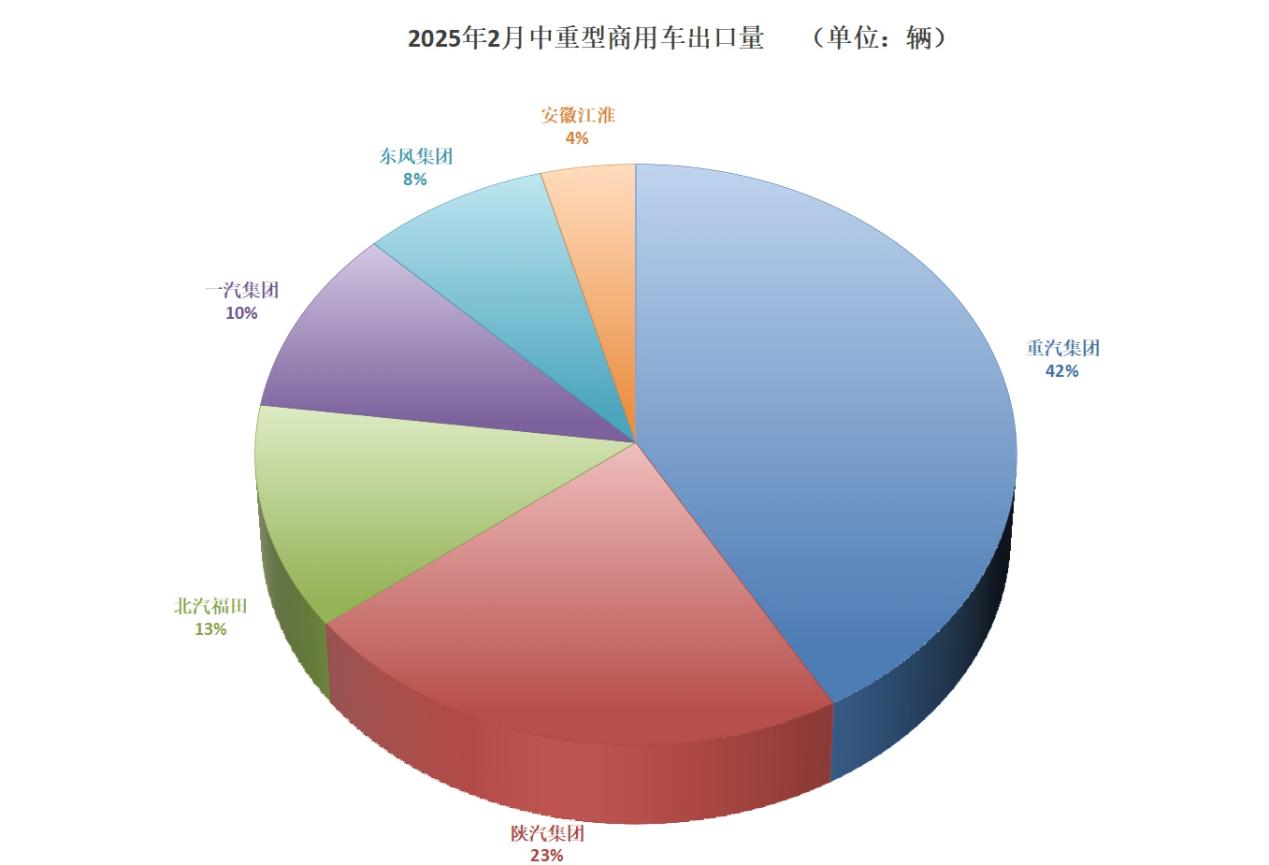 “中汽协”公布,2月我国商用车出口7万辆,环比下降6%,同比增长13.2%。国内增幅大于出口,这与外部环境的不确定性和因关税频起而引发的经济形势动荡有关。不过,中重卡出口量有所上升,实现2.4万辆,较1月环比增长7.1%。其中,中国重汽出口约1万辆,占据中重卡出口份额41.7%;陕汽集团紧随其后,以出口5500辆排名第二位,份额22.9%;北汽福田出口3000辆;一汽解放出口近2500辆;东风集团出口2000辆;安徽江淮出口1000辆,以上六家车企覆盖了我国中重卡出口九成以上份额。