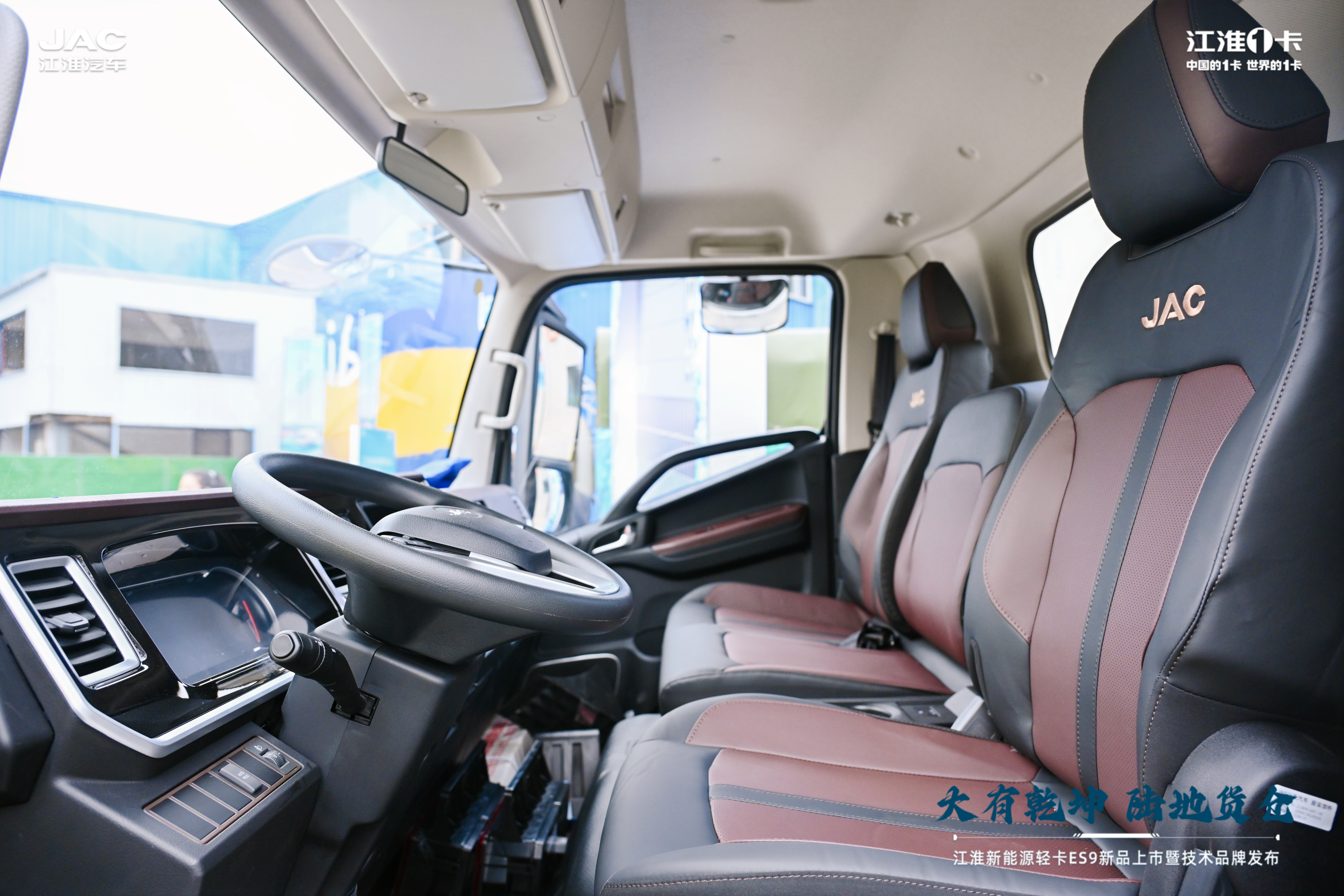江淮新能源轻卡ES9匹配2090行业同级别最宽驾驶室,轿车化怀档+电子手刹+1.9米贯穿式座椅,腿部空间更大可卧可躺,加上30余处储物空间,打造移动居家生活舱;10.4寸高清智能屏、60W快充、加大型复合曲率后视镜智驾-远程控制、人车交互,以及L2级智能辅助驾驶,让出行更舒适。