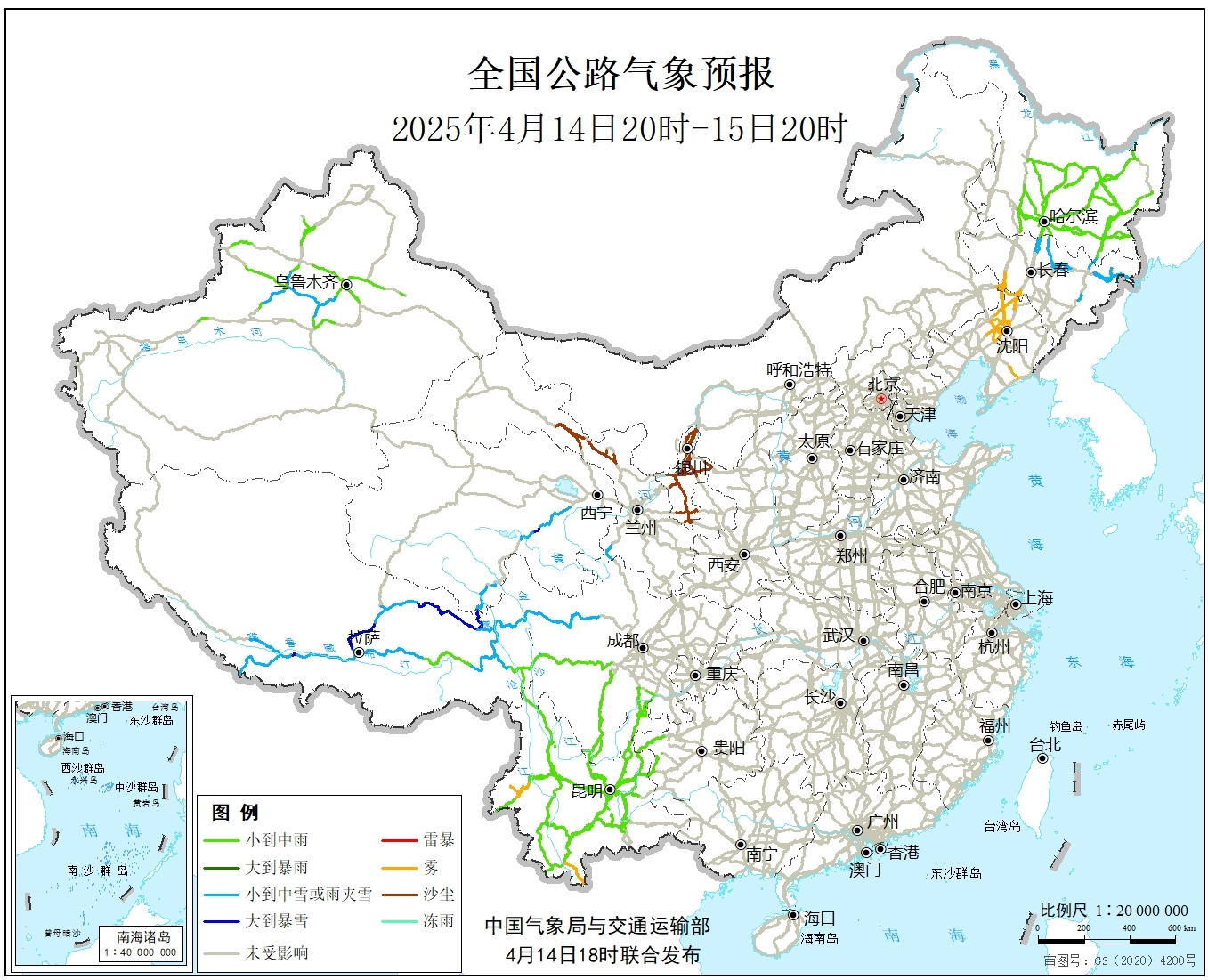 4月14日20时至15日20时,新疆沿天山地区、吉林东部和北部、西藏中东部和南部、青海东南部、川西高原北部等地部分地区有小到中雪或雨夹雪,其中,西藏中部和东北部、青海东南部等地部分地区有中到大雪,局地暴雪。黑龙江中东部、新疆北部、西藏东南部、川西高原南部、四川南部、云南大部等地部分地区有小到中雨。辽宁北部和东南部、吉林南部、云南南部等地局地有雾。另外,甘肃西部、宁夏等地局地有沙尘。