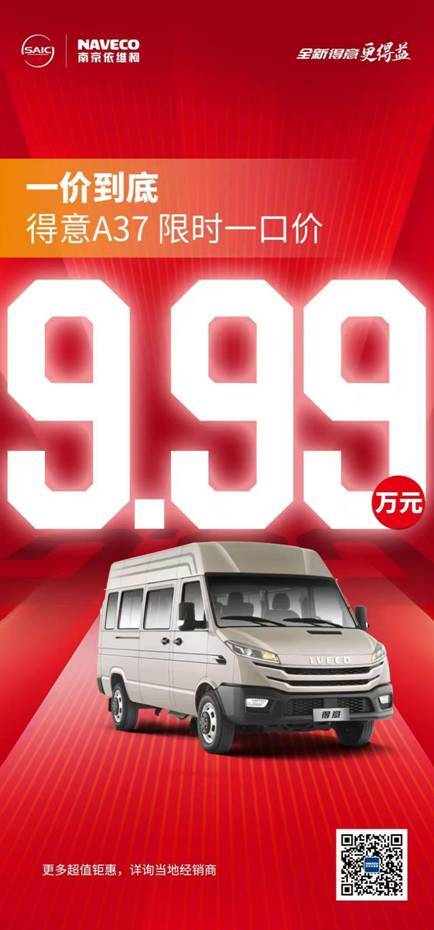 9.99万开走依维柯得意A37,省下的购车预算,能多囤油卡、多接订单;超强的装载与运输效率,让你每天多跑两趟,收入蹭蹭涨!感兴趣的车友可以咨询当地经销商,让这台硬核轻客成为你创富路上的“钞”能力伙伴,开启日进斗金的狂飙模式!