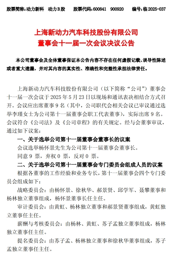 5月24日,动力新科发布公告,公司董事会十一届一次会议于2025年5月23日以现场和通讯表决相结合方式召开。经与会董事审议,通过如下议案: