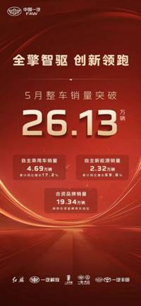 根据中国一汽最新发布的销量快报,2025年5月,中国一汽整车销量突破26.13万辆,同比增长7.5%,持续保持行业领先地位。其中,一汽解放5月国内中重卡终端份额达22.4%,延续了高质量发展的强劲势头。