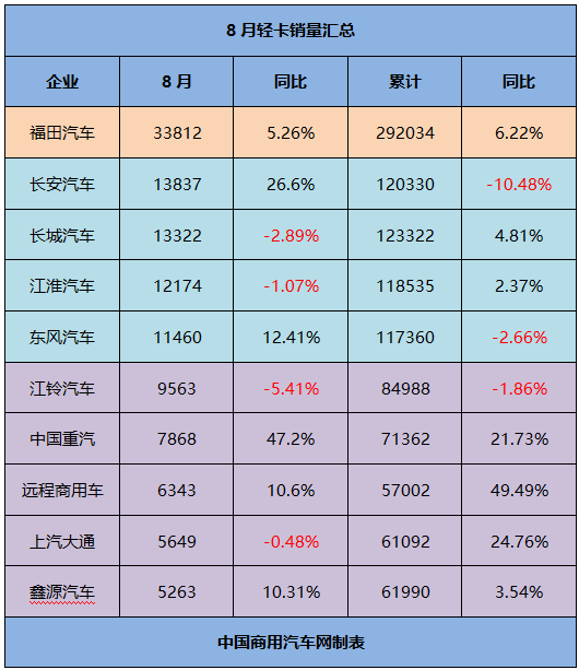 福田领跑 重汽领涨 8月轻卡市场同、环比双增长