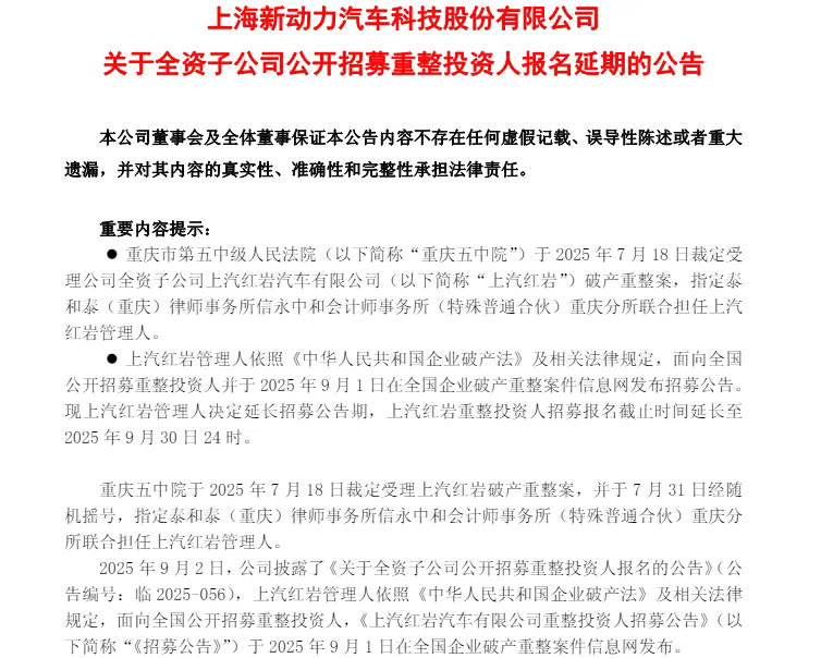 9月22日晚,上海新动力汽车科技股份有限公司发布关于全资子公司公开招募重整投资人报名延期的公告。公告显示,上汽红岩管理人考虑到部分意向重整投资人由于尚在履行内部流程或资料在途等因素,为确保上汽红岩招募和遴选重整投资人工作取得最优效果,同时保障参与各方的权利,决定延长招募公告期,延长重整投资人招募报名截止时间至2025年9月30日24时。除报名截止时间调整外,招募公告其余事项均不作任何调整。