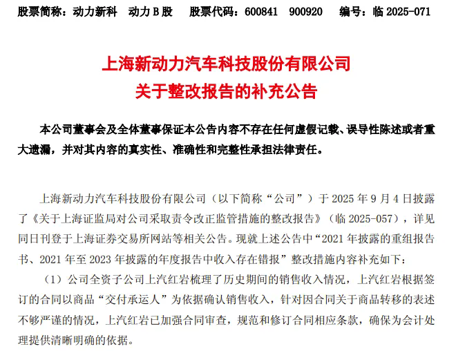 上海新动力汽车科技股份有限公司(以下简称“公司”)于2025年9月4日披露了《关于上海证监局对公司采取责令改正监管措施的整改报告》(临2025-057),详见同日刊登于上海证券交易所网站等相关公告。现就上述公告中“2021年披露的重组报告书、2021年至2023年披露的年度报告中收入存在错报”整改措施内容补充如下:
